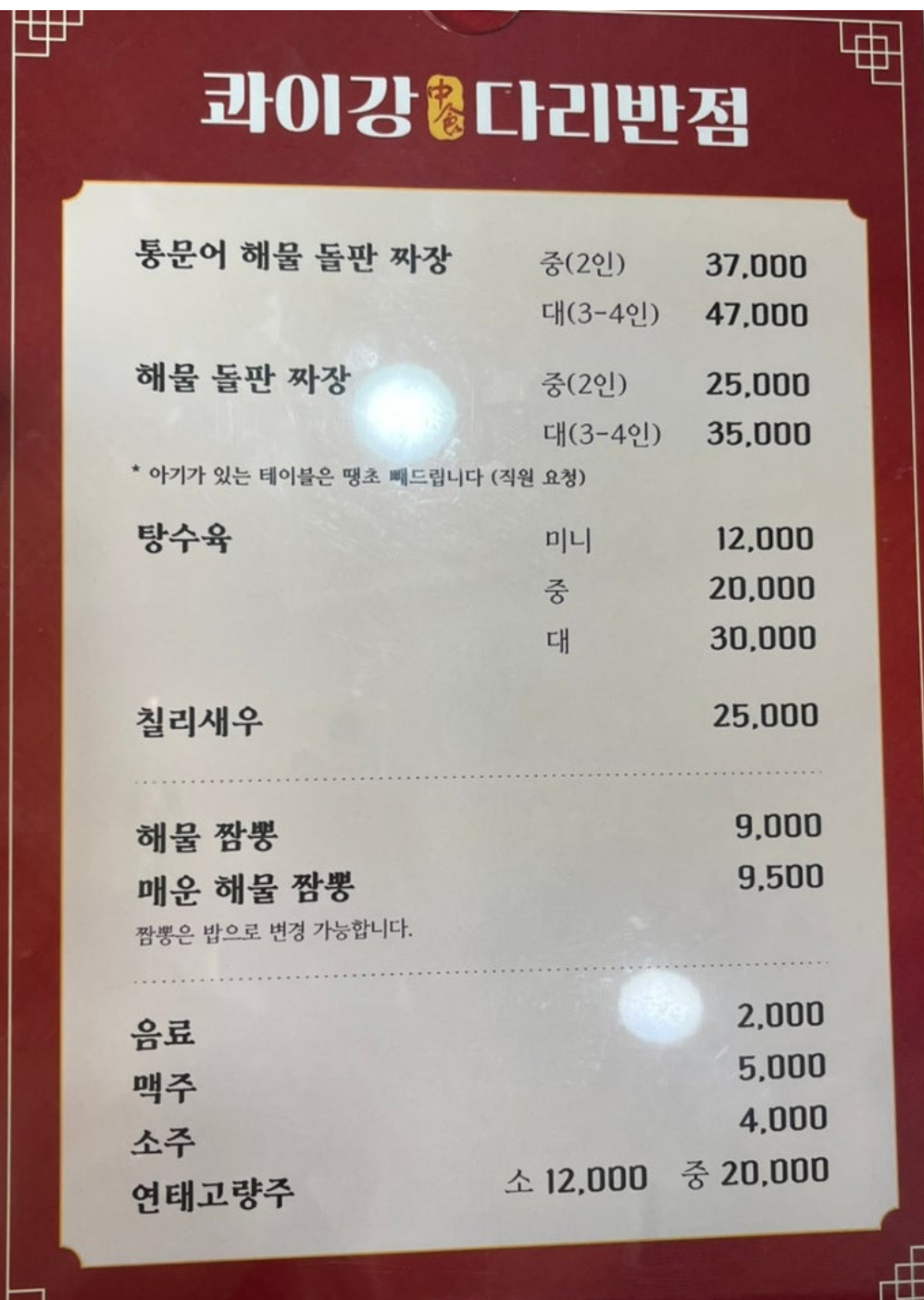 창원맛집 콰이강다리반점의 매뉴판입니다.